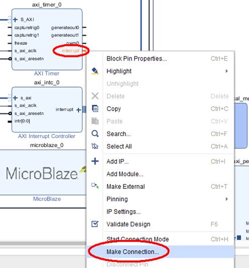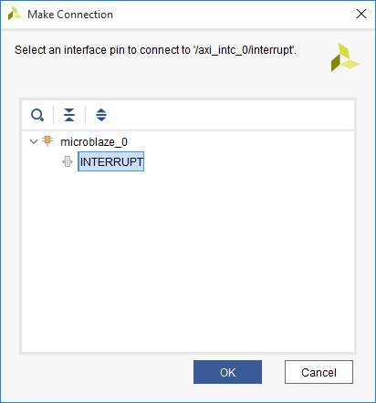 6. Connect the interrupt output of the timer to the intr input of the interrupt controller. The interrupt controller has 32 input lines, but we will use only one interrupt input in this example. The connection, polarity and interrupt input type (level or edge) is automatically set by Vivado.