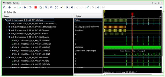 After running the software, you should see that the logic analyzer triggered and its waveform window contains the waveforms registered by ILA: