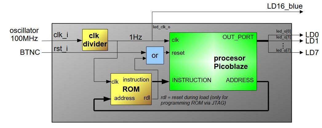 Celem ćwiczenia jest opracowanie systemu mikroelektronicznego z procesorem Picoblaze, w którym część sprzętowa realizuje dzielenie częstotliwości zegara oraz multipleksowane wyświetlanie na wyświetlaczu LED. Do zadań oprogramowania należy odczyt przycisków i w zależności od tego zwiększanie lub zmniejszanie licznika i wysłanie tej informacji na wyświetlacz LED.