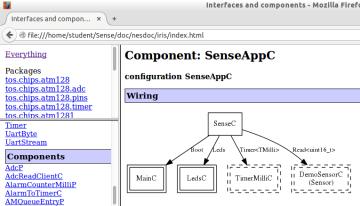 Moduły osadzone w konfiguracji SenseAppC.nc, tj.: MainC, LedsC, TimerMilliC i Sensor zapewniają (provide) interfejsy, których moduł SenseC używa (uses). Moduł SenseC nie zapewnia żadnych interfejsów, gdyż jest to moduł toplevel w tej aplikacji i nie będzie on wykorzystywany w innych modułach.